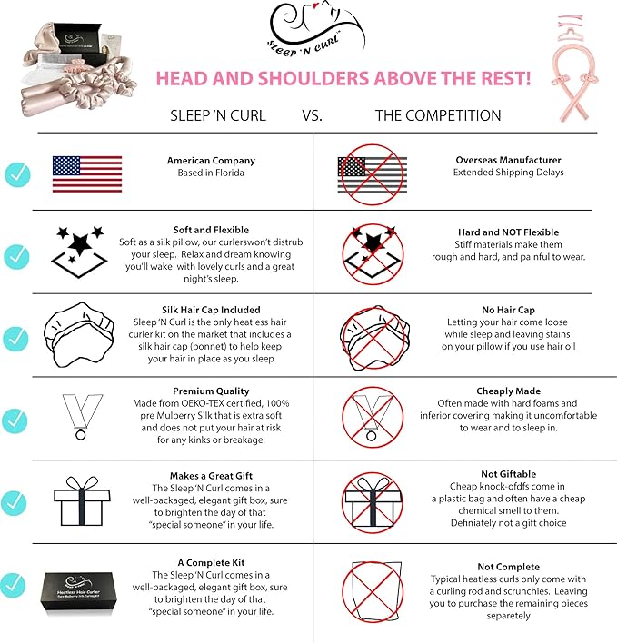 - ✅♡ A COMPLETE KIT: No other heatless hair curler set on the market comes with a silk ribbon curler, silk sleeping cap, two silk scrunchies, hair clip and an organza travel bag! Sleep ‘N Curl gives you everything you need.